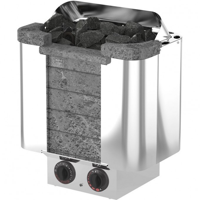 Эргономичная, стильная и функциональная электрокаменка CUMULUS CML-60NB-P от компании SAWO станет настоящей находкой для парных помещений объёмом 5-8 метров кубических. Печь устанавливается навесным способом на стену. Основным материалом для производства финские инженеры избрали устойчивую к коррозии высококачественную нержавеющую сталь. Материал обеспечивает не только длительный срок эксплуатации, но и достойный внешний вид электрокаменки. Особой изюминкой печи CUMULUS CML-60NB-P является облицовка из талькохлорита фронтальной части печи. Сверху печь имеет 2 арома чаши из натурального камня, что непременно оценят любители ароматерапии. Электрокаменка вмещает в себя до 18 кг камней, которые вместе с талькохлоритной облицовкой массой 10 кг ускоряют прогрев сауны и снижают расход электроэнергии на поддержание нужной температуры воздуха. Подливая на камни воду или отвар из трав, вы быстро наполните парную большим количеством лёгкого мелкодисперсного пара. Управление SAWO CUMULUS CML-60NB-P осуществляется при помощи встроенной в нижнюю часть каменки панели управления.